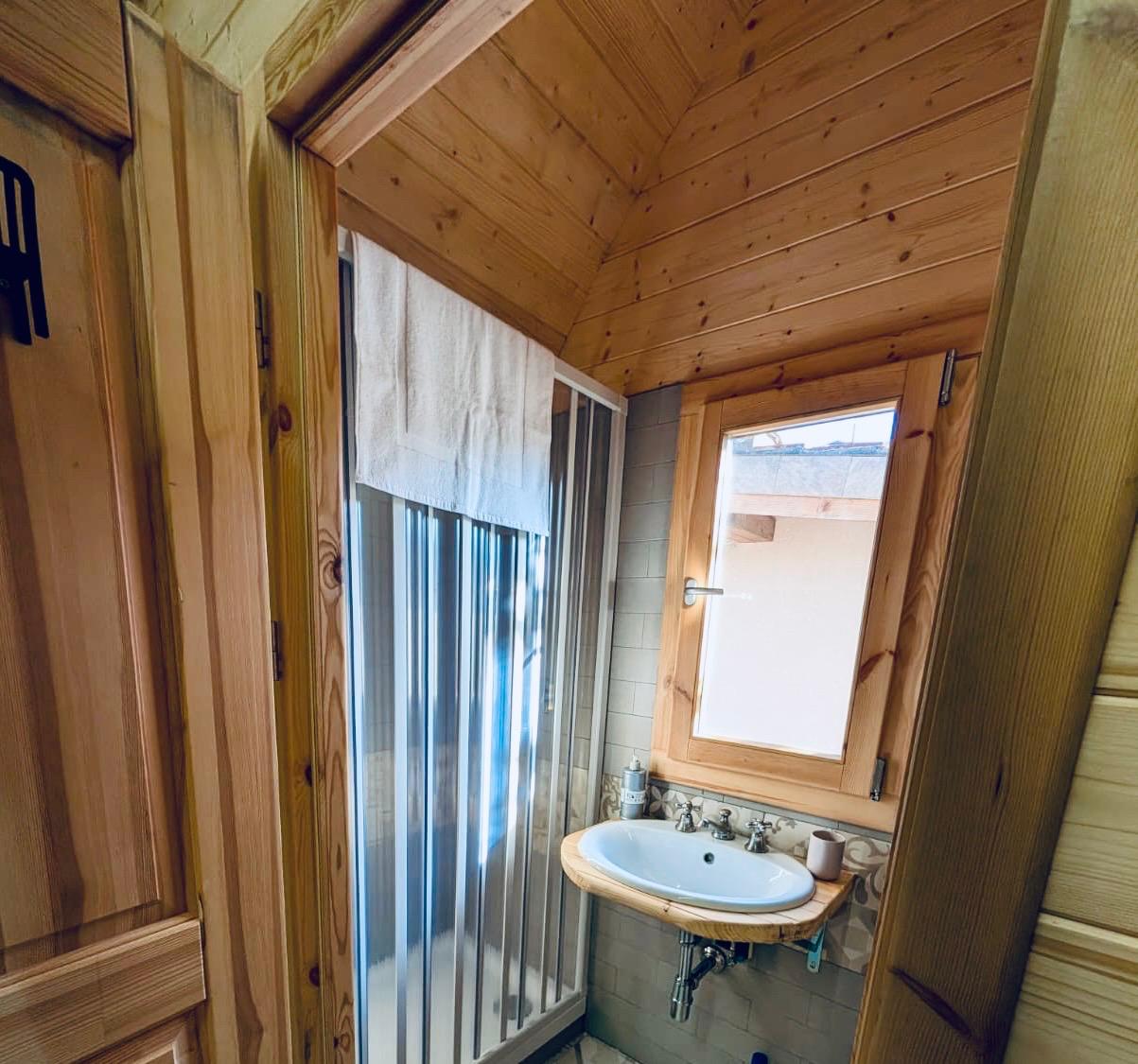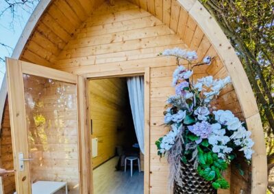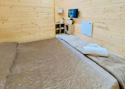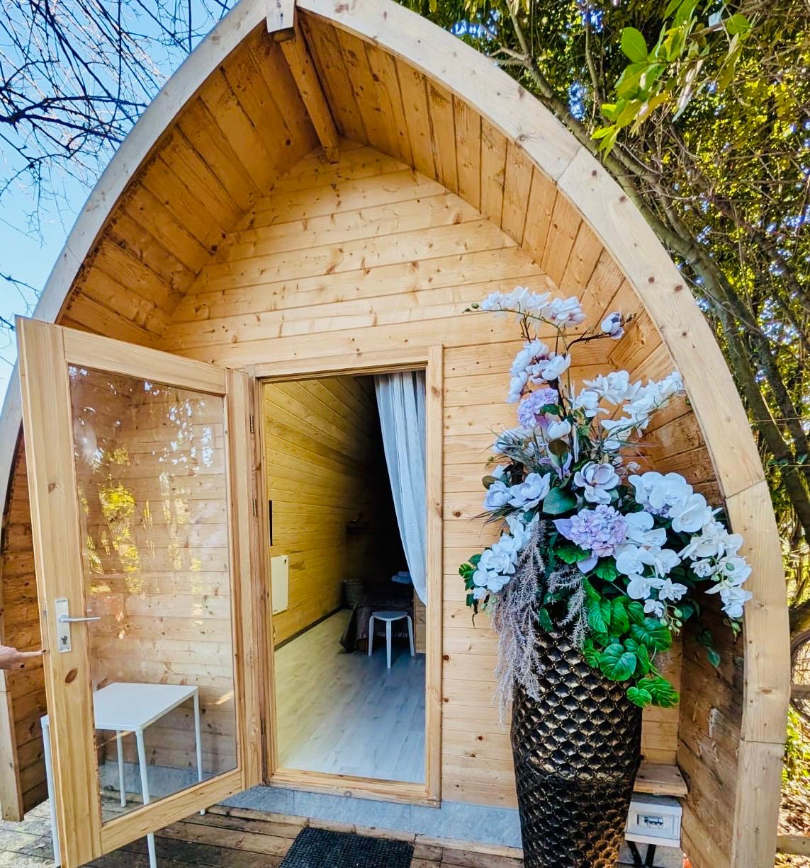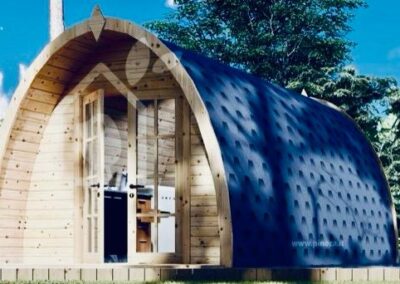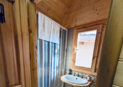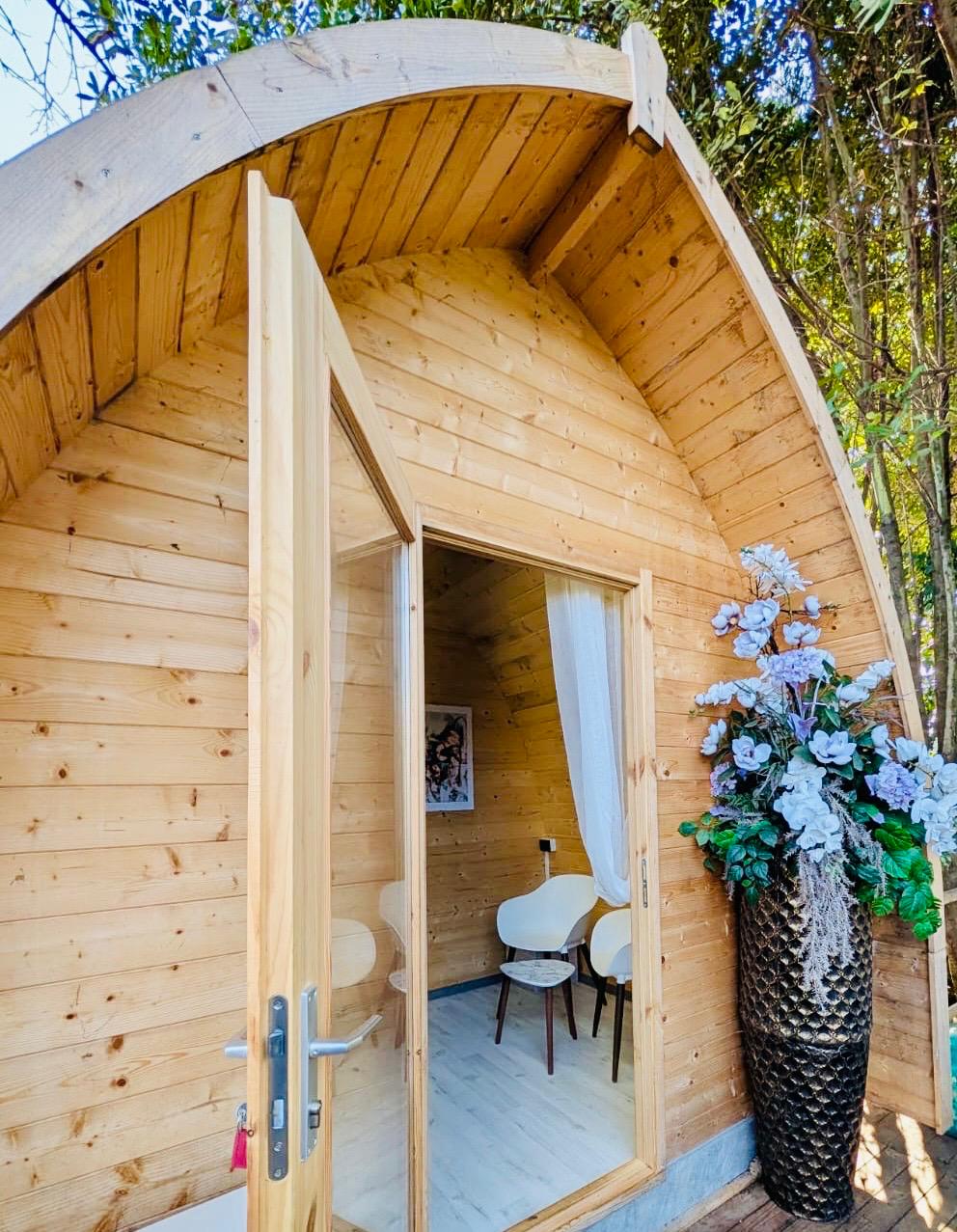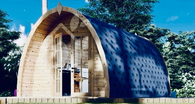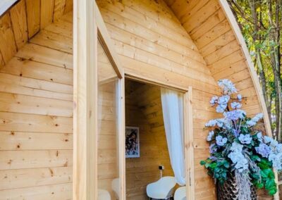 Caratterizzato da ampie vetrate, offre interni caldi con legno a vista, una camera spaziosa, zona giorno, garantendo un’esperienza di glamping sostenibile e suggestiva.