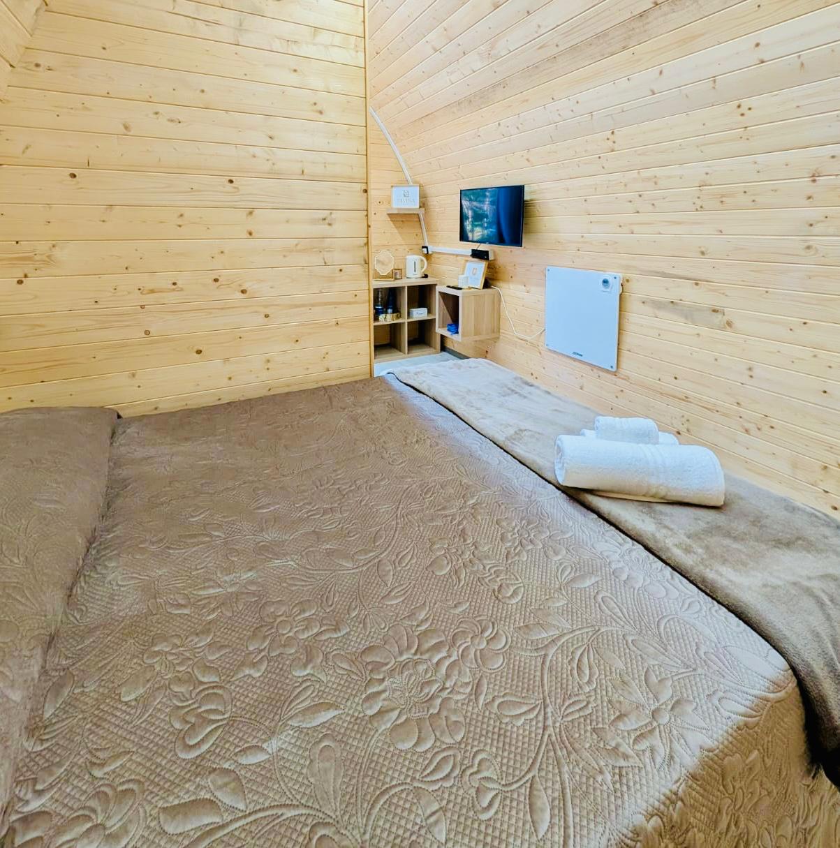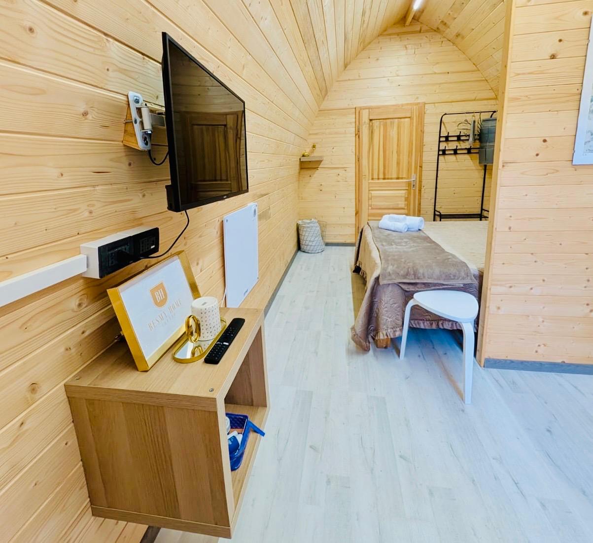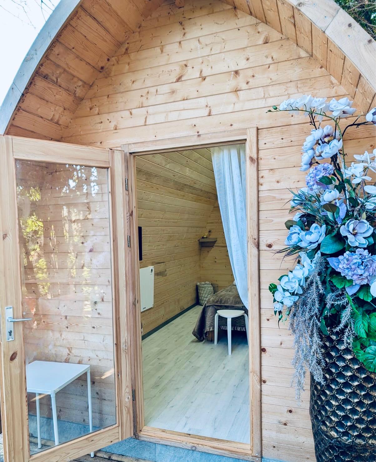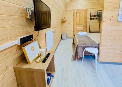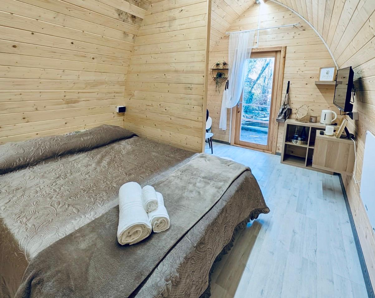 Caratterizzato da ampie vetrate, offre interni caldi con legno a vista, una camera spaziosa, zona giorno, garantendo un’esperienza di glamping sostenibile e suggestiva.